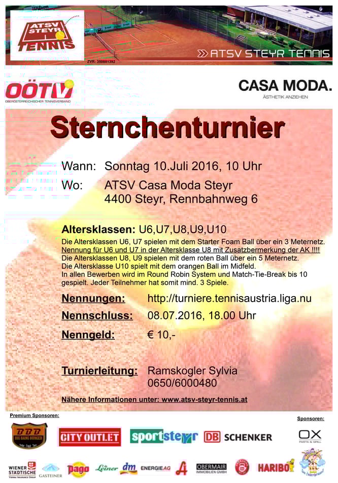 Am Sonntag den 10. Juli 2016 ab 10 Uhr findet auf der Anlage des ATSV Casa Moda Steyr ein Sternchenturnier für die Altersklassen U6/U7/U8/U9/U10 statt.